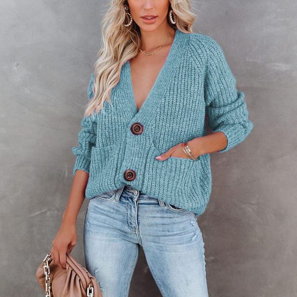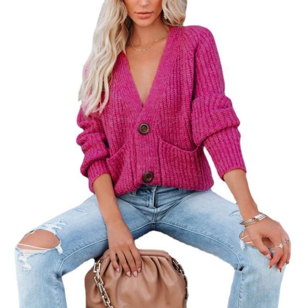 Casual Baggy Ribbed Knit V Neck Button Up Cardigan Sweater With Pocket