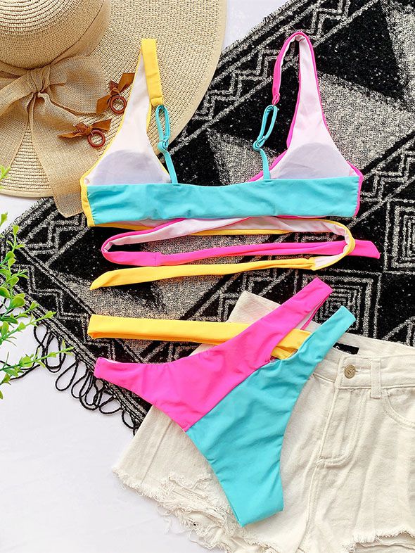 Multiway Rainbow Colorblock Criss Cross Lace Up Wrap Tie Bikini