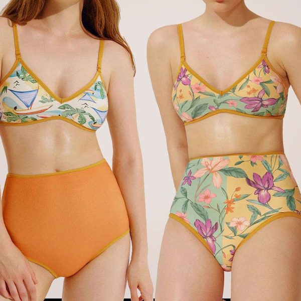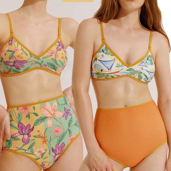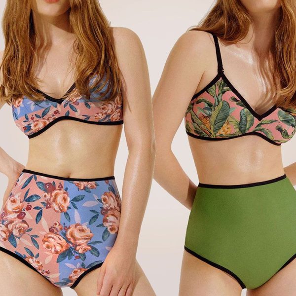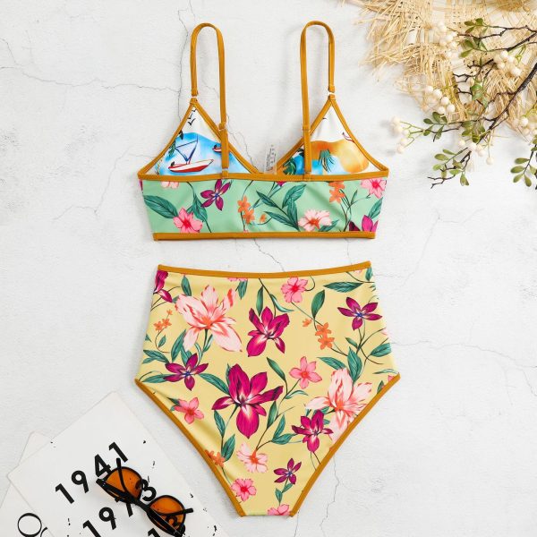 / Reverse Two Sides Block Trim Tropical Floral High Waist Tummy Control Swim Suit
