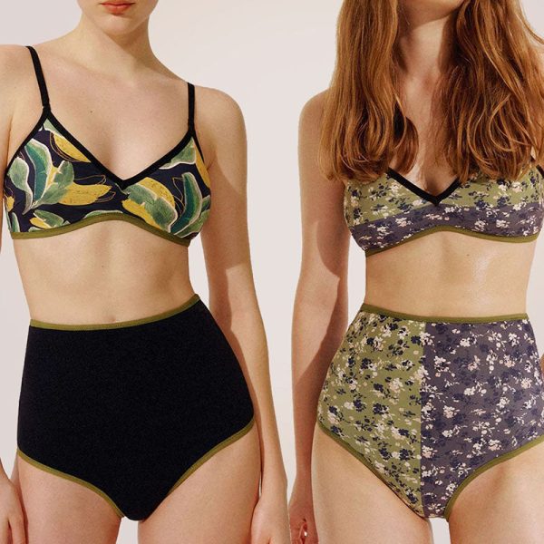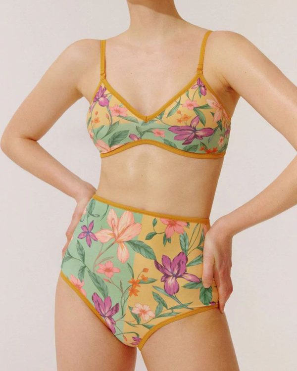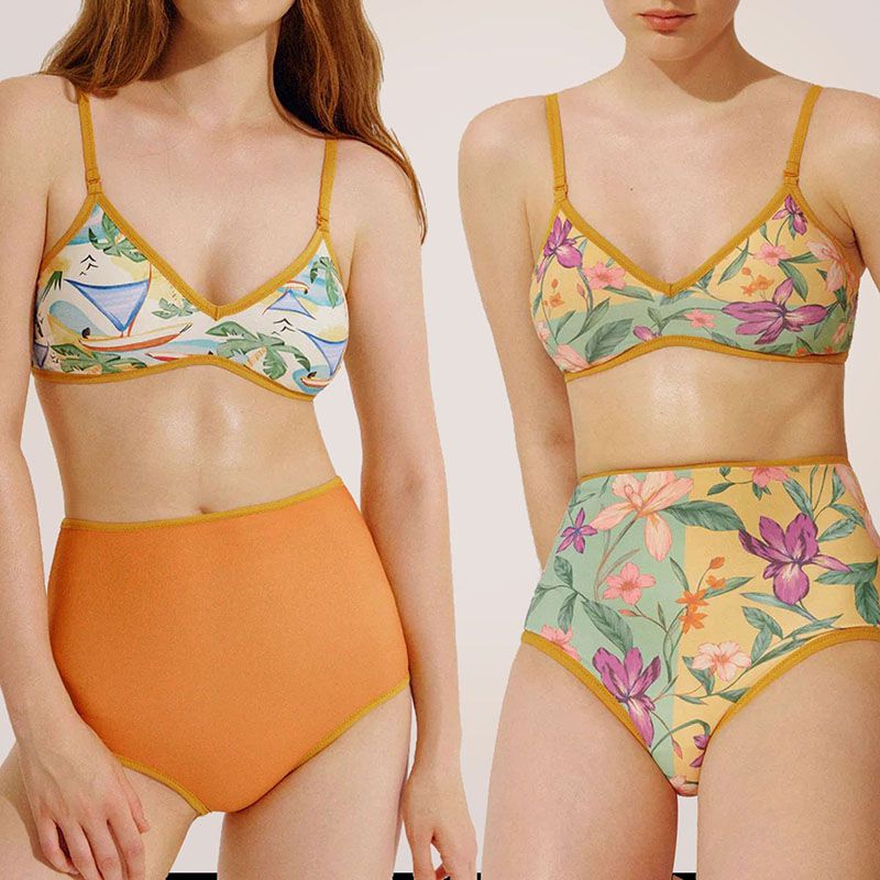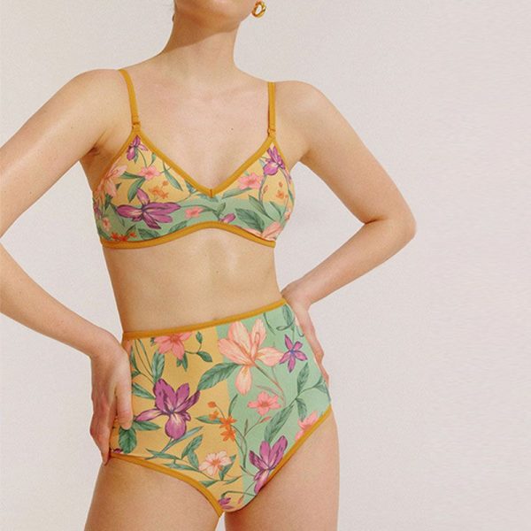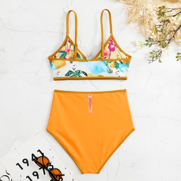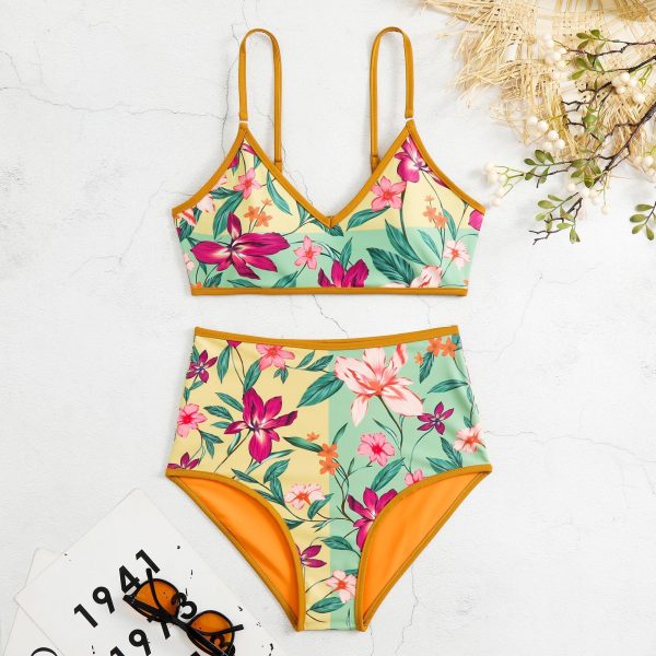 Reverse Two Sides Block Trim Tropical Floral High Waist Tummy Control Swim Suit quantity