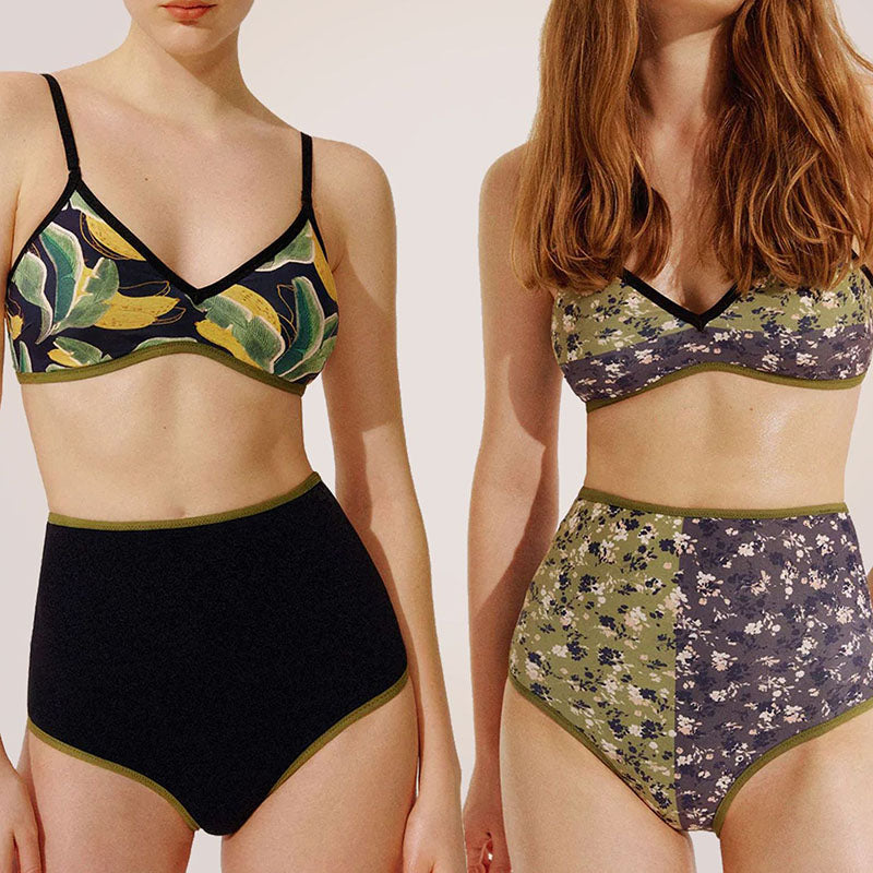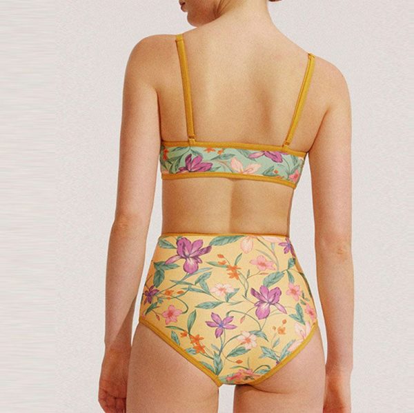 Reverse Two Sides Block Trim Tropical Floral High Waist Tummy Control Swim Suit